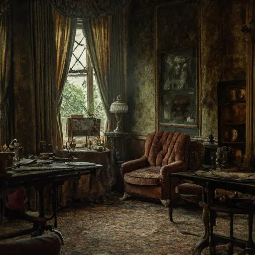 Upstairs, the corridor’s runner rug droops in dusty folds, its once-earthy pattern worn to pale outlines. A hall table holds a cracked spectacles hinge, a fossil brush worn to its nub, and a page of half-noted dates ending abruptly. Pale rectangles on the wallpaper reveal where fossil diagrams once hung.