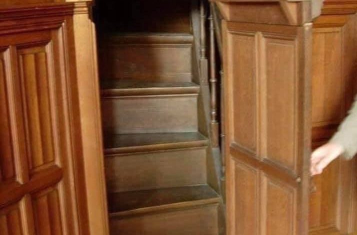 Hidden staircase leading to a secret room inside a 19th century Victorian home.