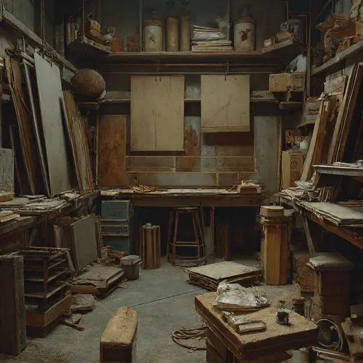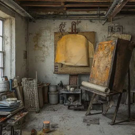 The Atelier vibrates with absence, the blueprint open on a table, pencil lines faintly tracing intended forms. Canvases await application, pigments dry in jars, and the air smells faintly of turpentine and neglected oil. Nothing is disturbed; each brush, ruler, and t-square lies ready for return.
