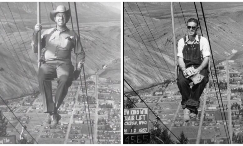 From the 1950s through the 1970s, riders at the Snow King Chairlift in Jackson, Wyoming experienced something that would be almost unthinkable today. They dangled hundreds of feet above the rugged valley floor on simple open chairs with absolutely no safety bar, no harness, and no restraint of any kind. Men, women, and entire families — including young children — would sit casually on these exposed wooden or metal seats as they slowly ascended the mountain. One famous old photograph even shows a rider calmly holding his dog on his lap during the ride, both of them appearing completely relaxed and unbothered by the dizzying height below.This was the raw, no-frills reality of skiing and mountain recreation during that era.